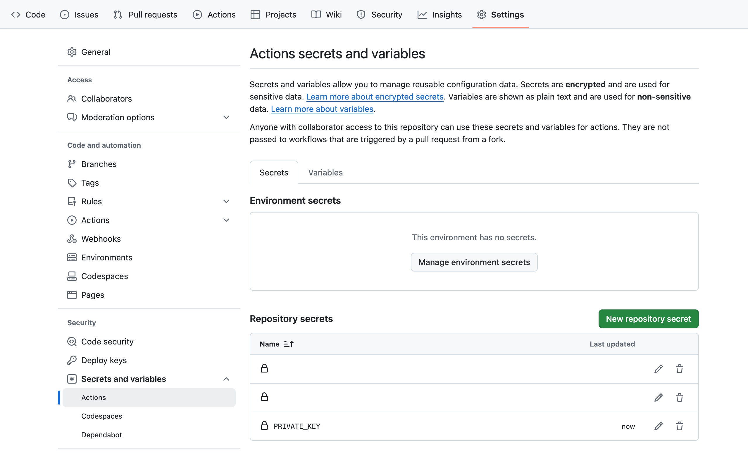 You need add private key, gh-pages to working repo secrects under repo setting > Secrets and variables > Actions. Then press “New reporitory secret”. Give it a title.